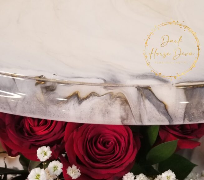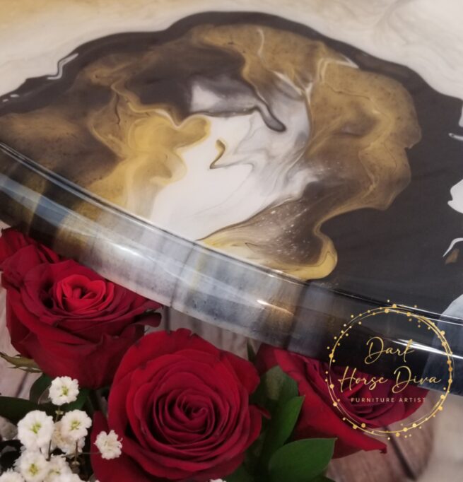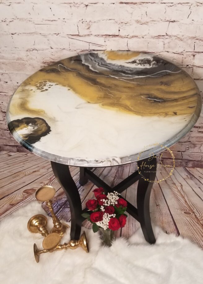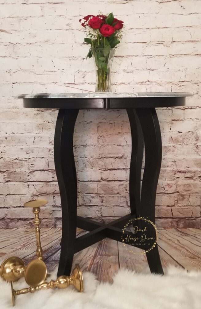 This pub height table is a show stopper and the glossy finish has you needing to run your hands over it! The pour had a mind of its own and created exactly what it wanted! Each angle has its very own unique look and you will be mesmerized all over again. To keep with the classic elegant look of the top I decided to paint the legs in a classic black with a glossy clear finish for added durability. Once the top was ready I did a glossy resin pour for a strong, lasting finish!
