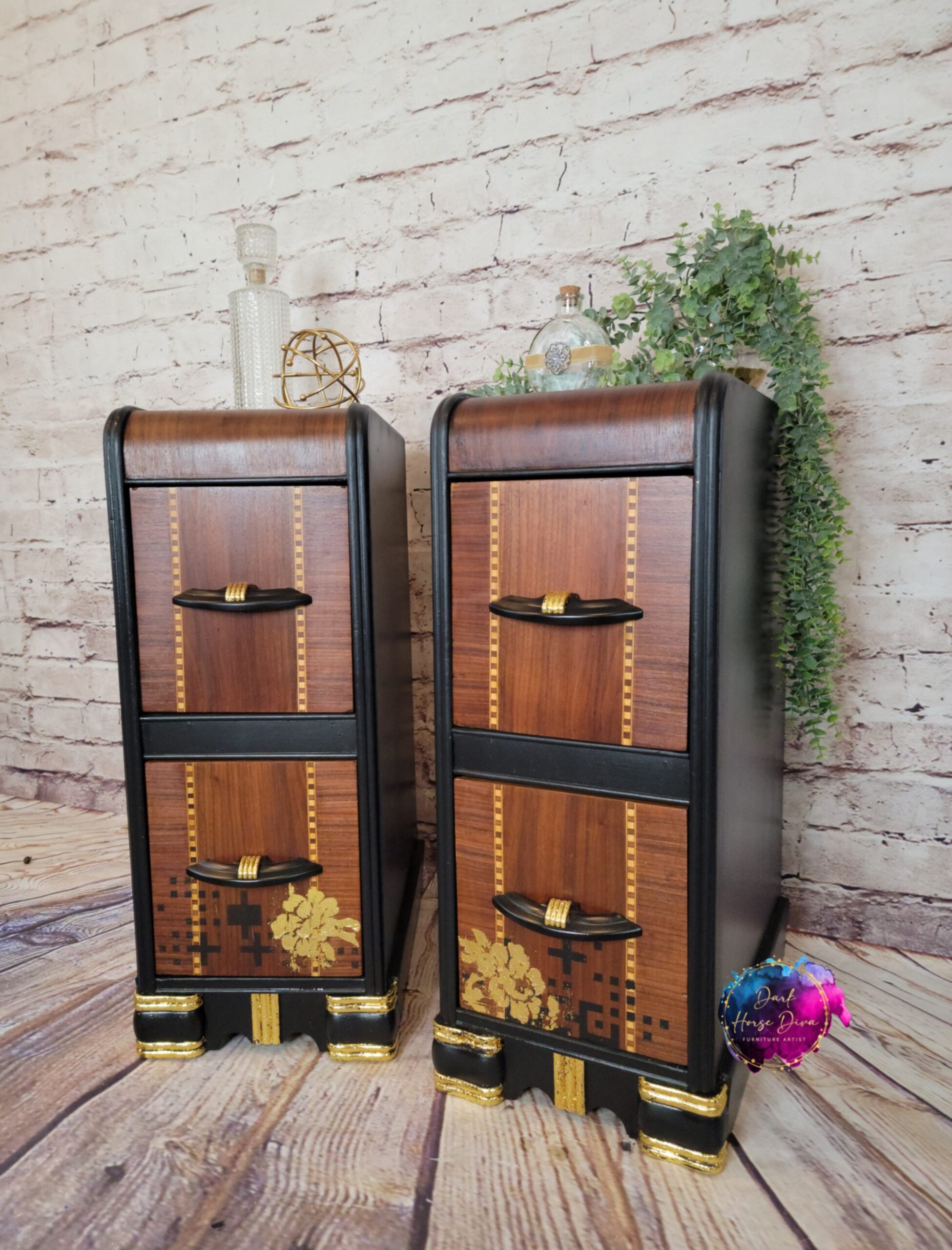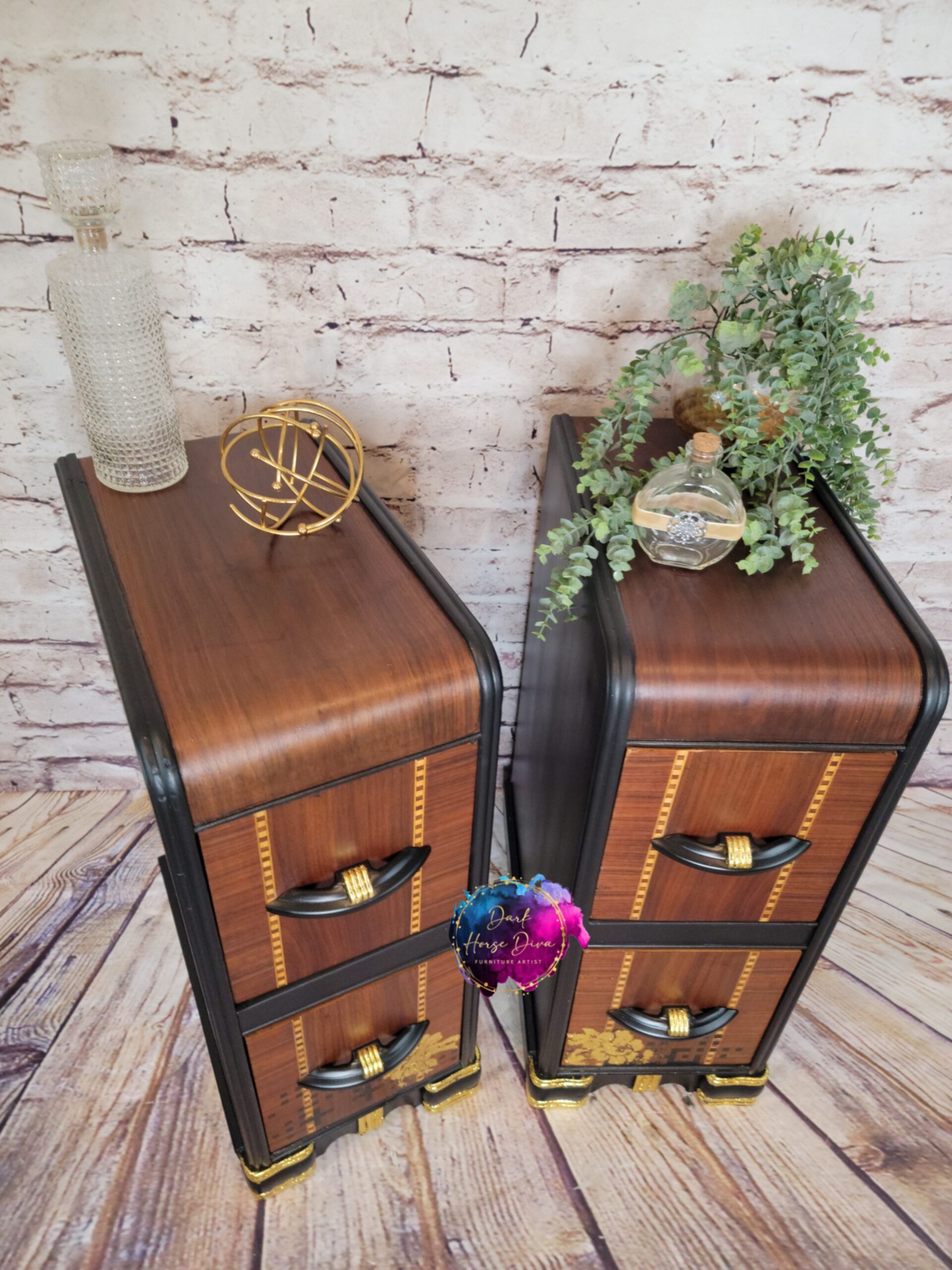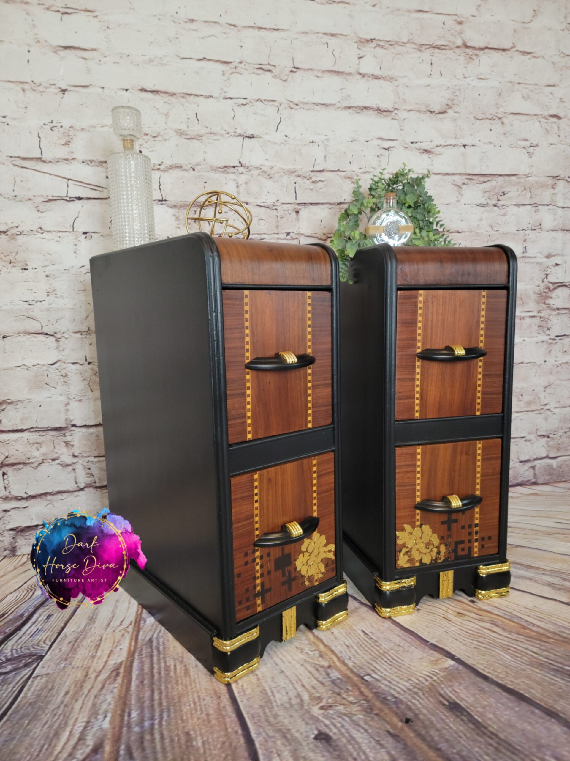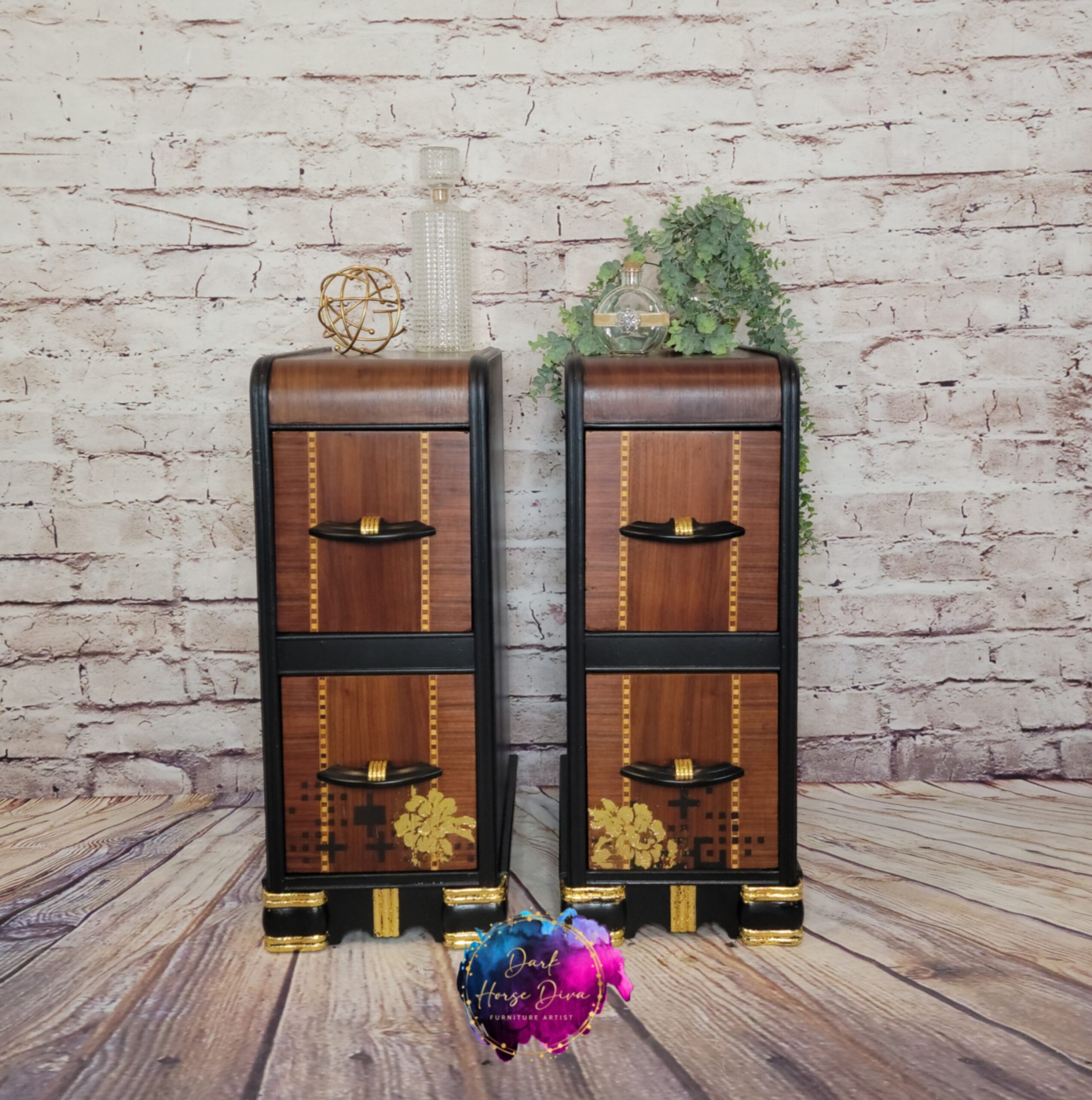 These waterfall end tables are classic and elegant with the original charm! I absolutely love the wood pattern on the drawer fronts and I wanted to highlight them. The black and wood combination is one of my favorites and is a classic look. I felt like they needed a touch of glam, so I added a little gold leaf to the bottom and original drawer pulls.